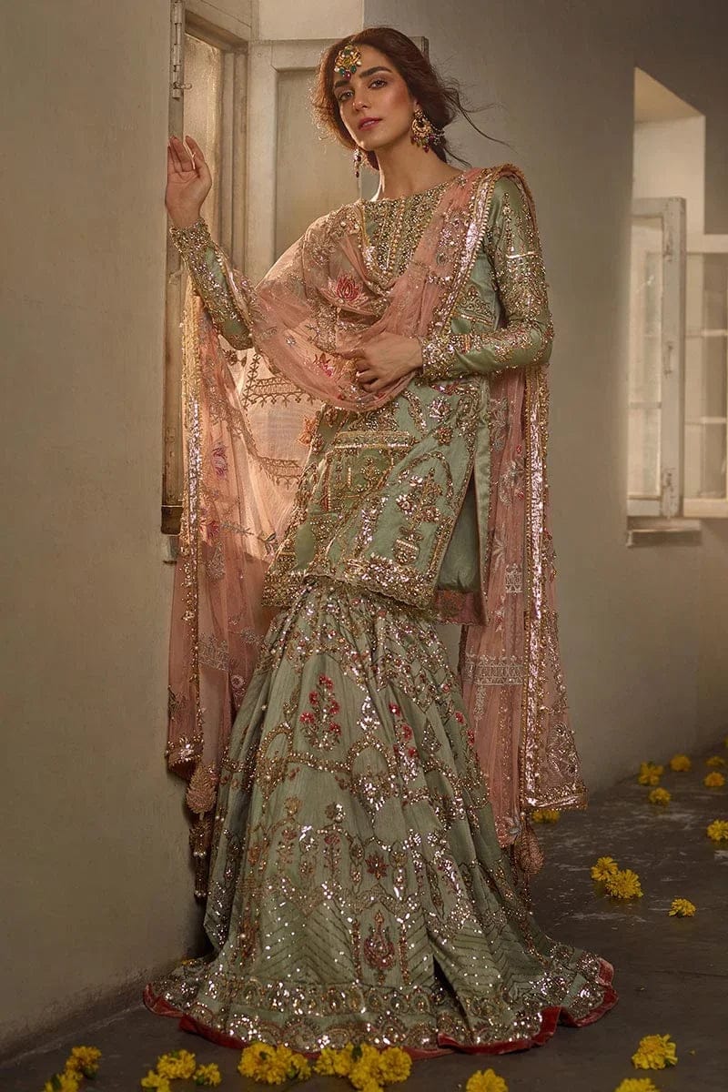 Fabric: Organza (Kameez & Gharara), Net (Jaal Dupatta), Organza (Foil Dupatta)