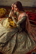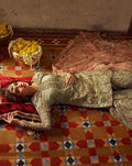 Complementing the kameez is a regal Organza gharara. It is richly worked with a fusion of silk floss, zari, and tilla, further enhanced with hand-placed stones to create a grand, shimmering silhouette.
