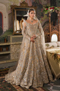 This mesmerizing Champagne gold and silver reception bridal becomes a canvas of dreams. The heavily embellished peshwas is an intricate pattern of gorgeous zardozi and fine resham craftsmanship. An ivory tulle dupatta with fully worked borders in 'ganga-jamni' and a trailing brocade lehnga with rich borders complete this grand and majestic bridal look. Every inch of this dreamy creation is hand worked to perfection. Fit for a modern day princess.