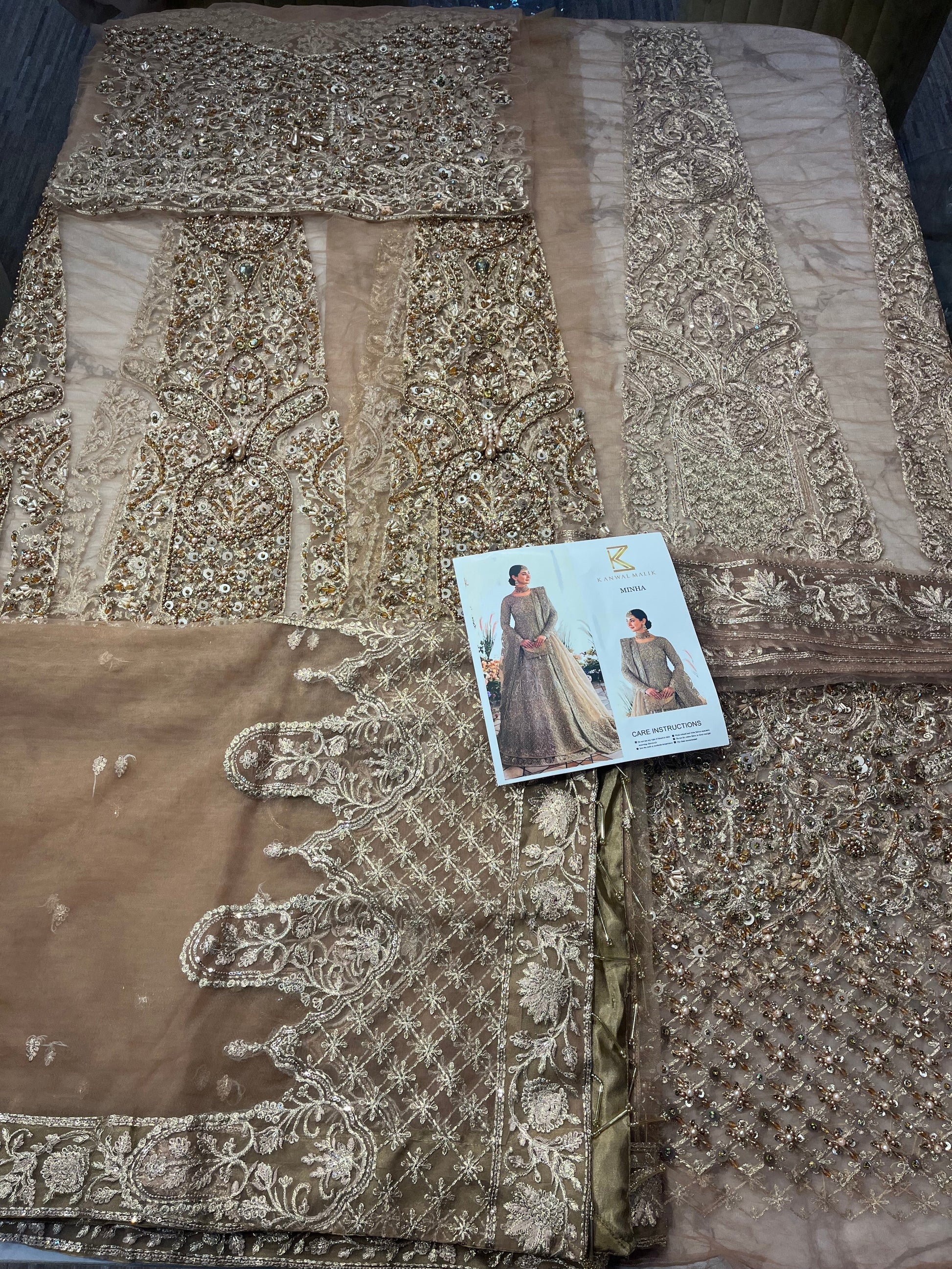 “Minha” is all about delicacy personified on a nude colored organza pishwas, which exhibits heavenly embellished geometric and floral patterns, adorned with rich, magnificent details. Paired with a self jamavar lehanga, with fully embellished exquisite border along with delicately paired with net dupatta with four sided embellished border and extended pallu and booti spray. Moreover, a beautiful light champagne luxe net veil with pearls spray and four-sided intricate border has been added to give a goddess look to the outfit.