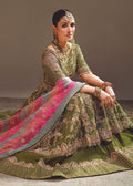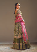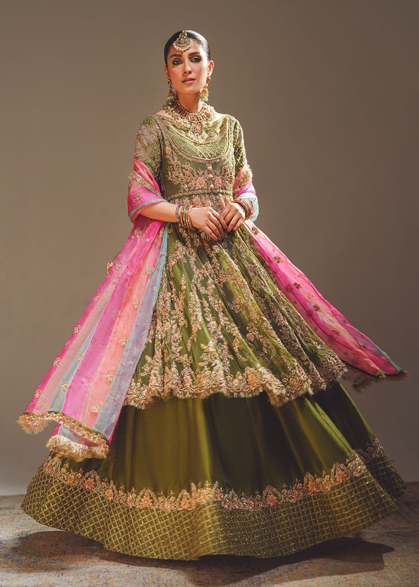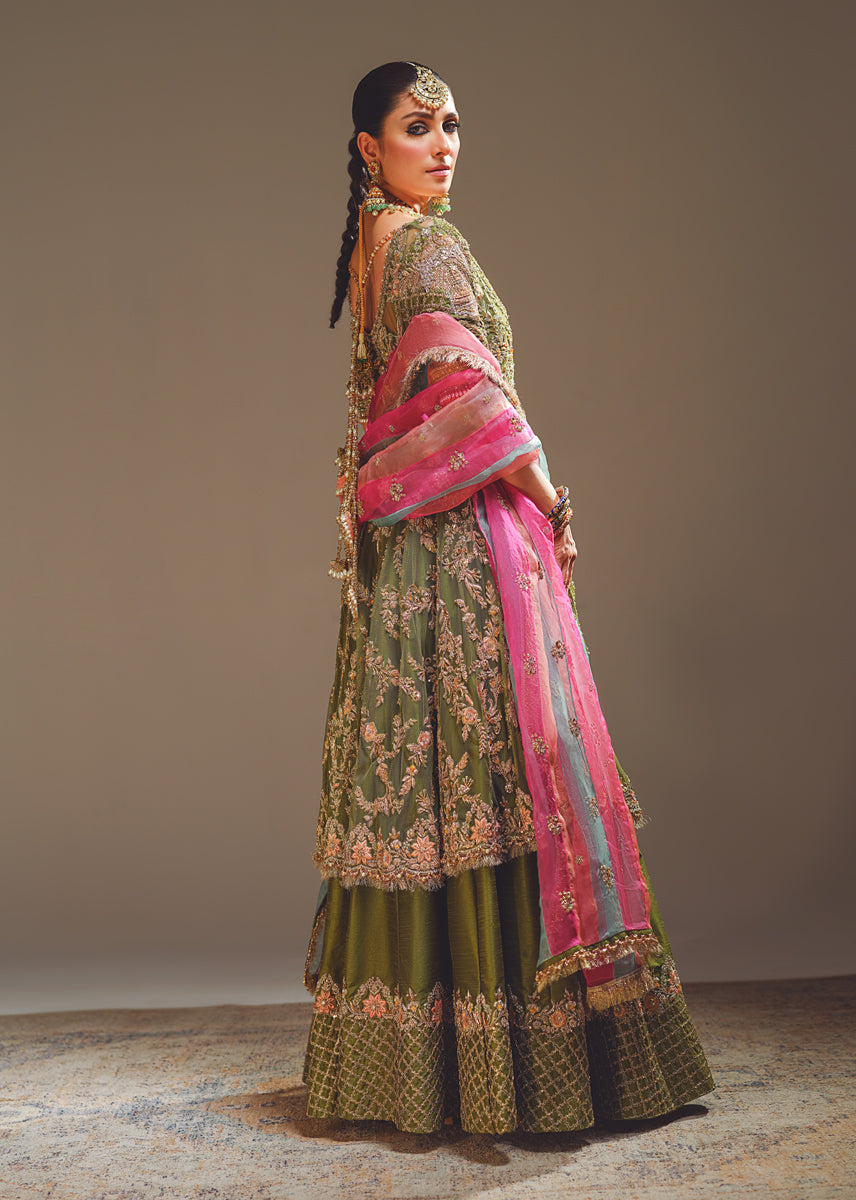 ‘Moss Royale’ beautifully complements the opulent gold and silver tones of the zardozi work, creating a contrast that is both regal and natural, similar to a lush forest foliage, it serves as the canvas where swirls and flowers interweave and meander in an artful dance, creating a design that is both organic and sophisticated.This outfit is a testament to the skill of artisans who have poured their creativity and expertise into every detail, making it a wearable work of art.The lehenga gracefully flares out from the waist, adding an extra layer of opulence and drama to the outfit in addition to the three-colored dupatta that is the crowning glory of this ensemble that adds delicacy and freshness to the overall look.
