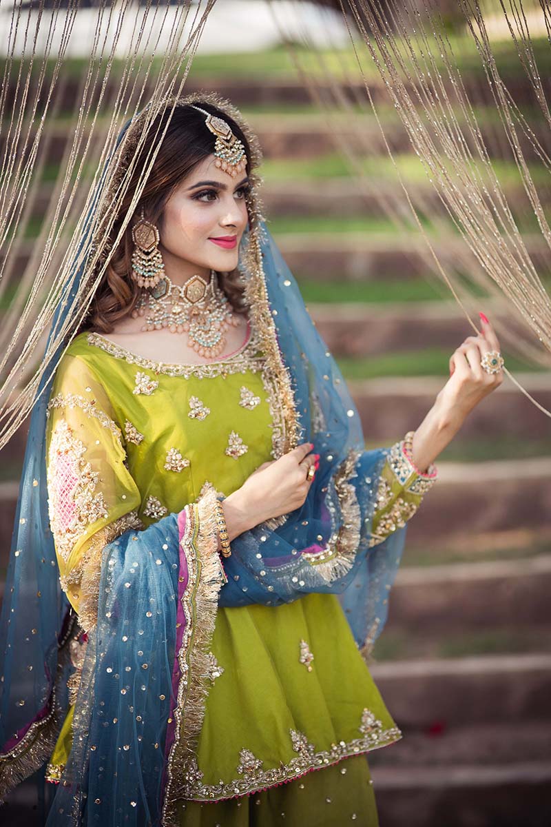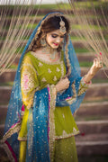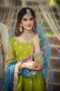 “Nageen” is A modern twist in a pink, crimson blue and olive green combination brought together