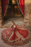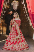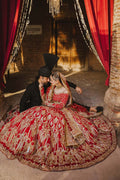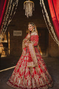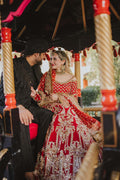 Deep red raw silk choli and lehnga paired with net duppata. Lehnga is heavily embellished with zari dabka and sequence.