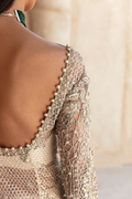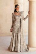 Holding a dreamy look with glorious handwork details and stunning ash-white color, opulent will surely make you feel like royalty. The net fabric drapes beautifully, while the sequenced combination of dabka, naqshi, cutdana, crystals, and pearls creates an ornated effect, that is simply breathtaking. A quintessential attire for weddings or any formal event, this dress proposes glamour and elegance.