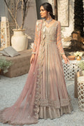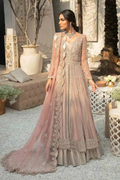Description: Toe Kiss length blush pink Net gown embellished with dramatic merge of rose Gold and silver naqshi dabka floral pattern has no shortage of intricate hand work details. Oxidized rose Gold tone tissue lehnga crafted by highly skilled technique along four-sided hand embellished scalped running boarder on net dupatta complete the silhouette.