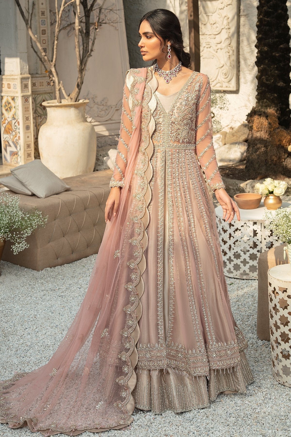 Work Technique: Embellished with dramatic merge of rose Gold and silver naqshi dabka are Handcrafted