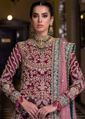 This elegant Magenta traditional Wear is an embellishment of full crafted embroidery to creatively decorate straight long shirt edged with bead tassels, Paired with aqua tone Sharara and a rose hue dupata with a sprawled ornamentation.