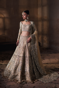 In the rhythm of bridal elegance, let the spotlight grace RAYA, a divine masterwork gilded in gold. This enchanting net creation unveils a poetic dance of details—a double-layered Tissue lehenga, where crush ruffles pirouette with whimsical grace. Embroidered with the delicate whispers of dori and mukesh, Raya emerges as the epitome of luxury, a refined verse woven with intricacy. Let your wedding day be adorned with the breathtaking details of this extraordinary ensemble.
