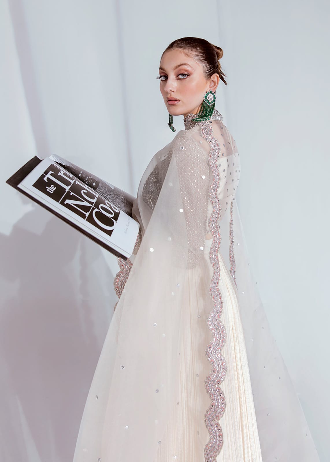 An exquisite organza choli featuring a sophisticated ban neckline. The piece is delicately embellished with silver sequins, pipe work, and Swarovski crystals, incorporating the patent Hussain Rehar palm tree motif for a signature avant-garde look.